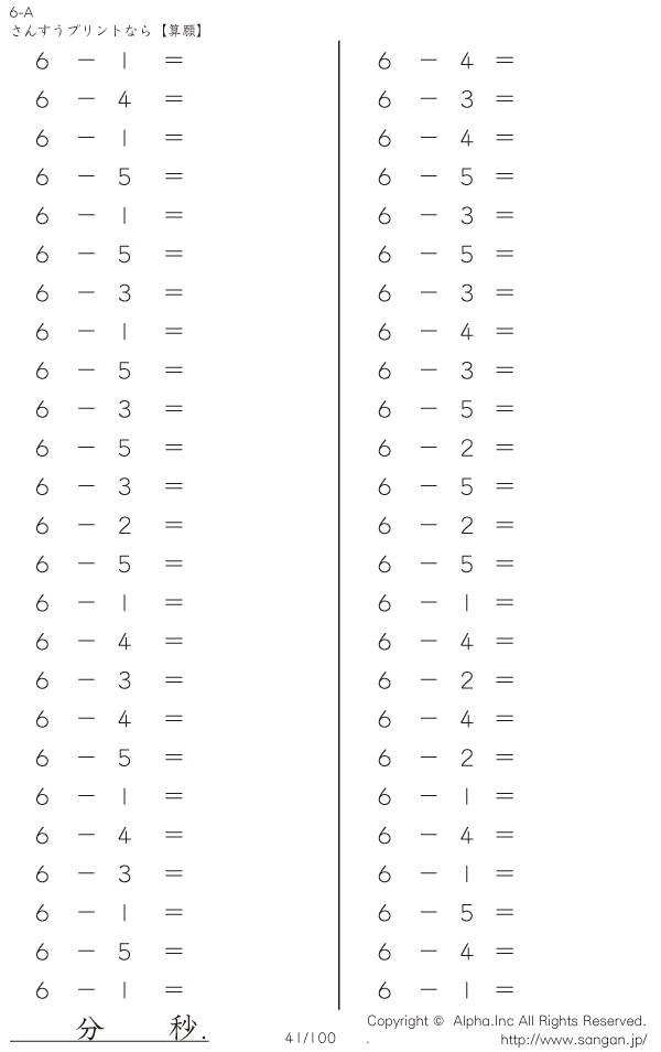 上記のボタンから「6-A…1桁の数値を1桁の数値で引く」の算数数学ドリル・計算ドリル(PDFプリント)がダウンロードできます。個人利用は無料です(家庭以外での配布は有料です)。