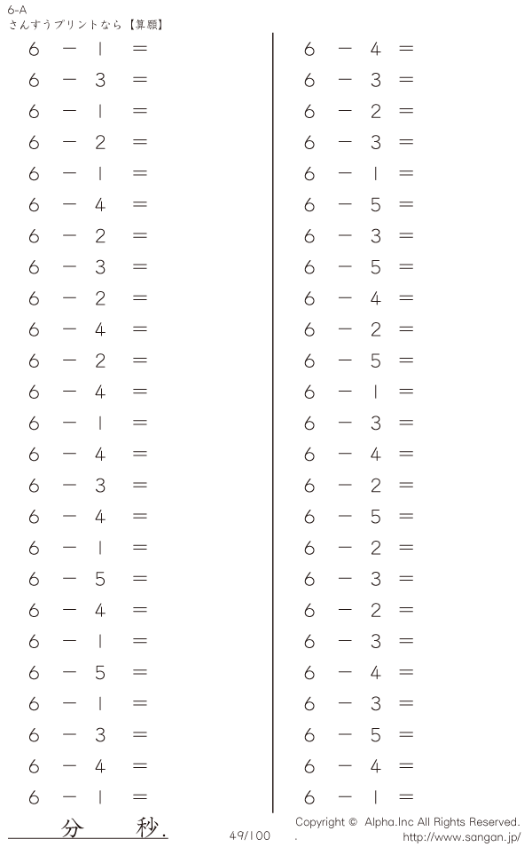 上記のボタンから「6-A…1桁の数値を1桁の数値で引く」の算数数学ドリル・計算ドリル(PDFプリント)がダウンロードできます。個人利用は無料です(家庭以外での配布は有料です)。