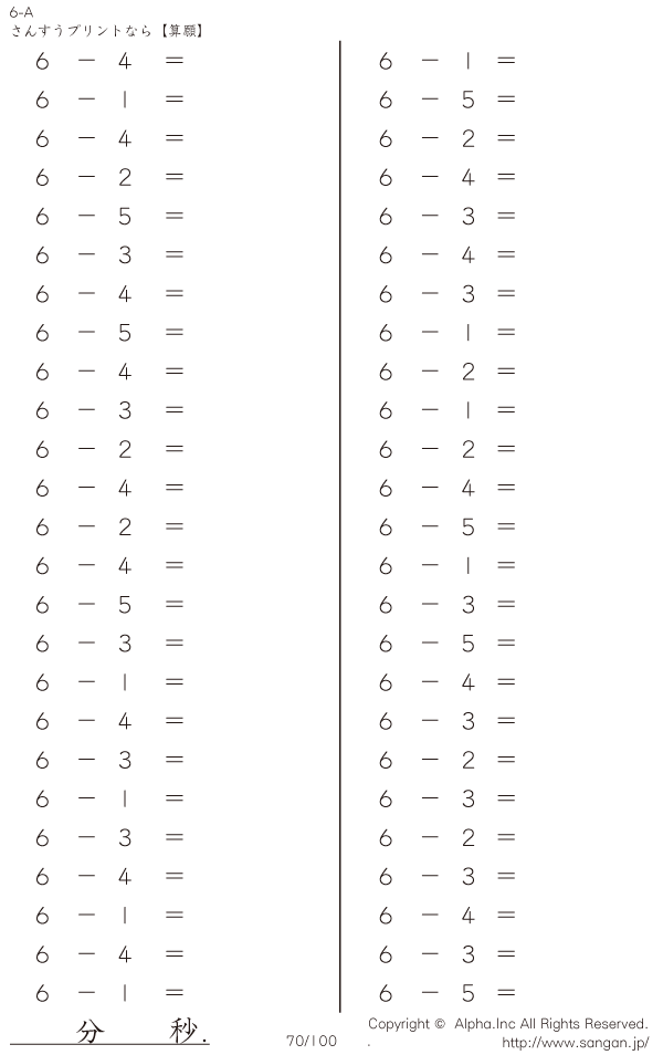 上記のボタンから「6-A…1桁の数値を1桁の数値で引く」の算数数学ドリル・計算ドリル(PDFプリント)がダウンロードできます。個人利用は無料です(家庭以外での配布は有料です)。