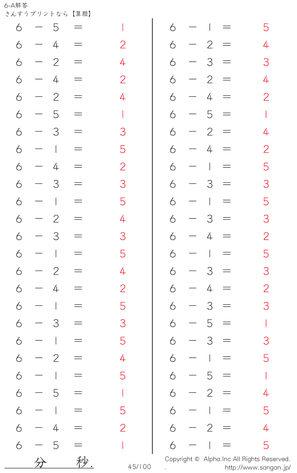 上記のボタンから「6-A…1桁の数値を1桁の数値で引く」の算数数学ドリル・計算ドリル(PDFプリント)がダウンロードできます。個人利用は無料です(家庭以外での配布は有料です)。
