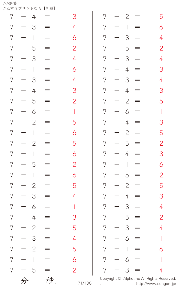 上記のボタンから「7-A…@50」の算数数学ドリル・計算ドリル(PDFプリント)がダウンロードできます。個人利用は無料です(家庭以外での配布は有料です)。