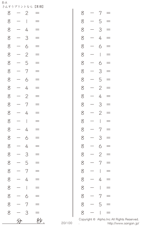 上記のボタンから「8-A…@50」の算数数学ドリル・計算ドリル(PDFプリント)がダウンロードできます。個人利用は無料です(家庭以外での配布は有料です)。