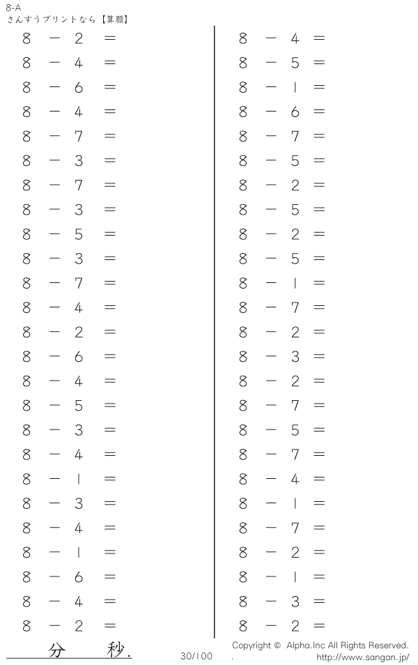 上記のボタンから「8-A…@50」の算数数学ドリル・計算ドリル(PDFプリント)がダウンロードできます。個人利用は無料です(家庭以外での配布は有料です)。