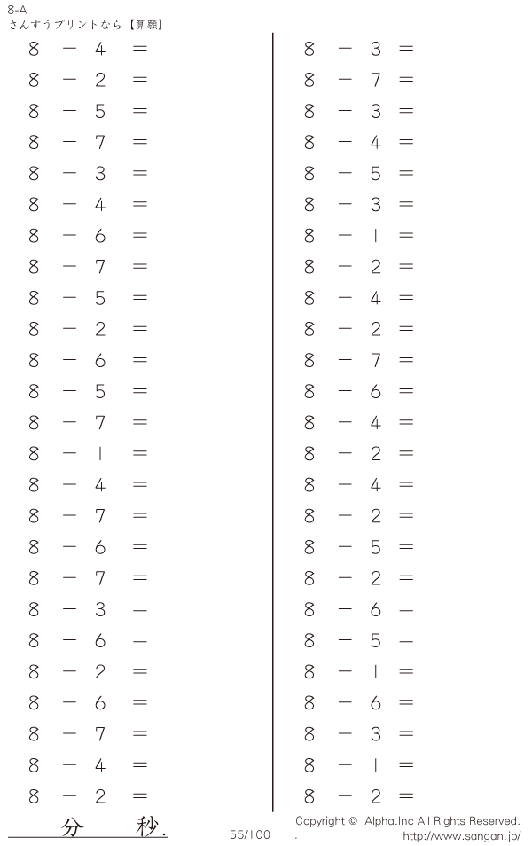 上記のボタンから「8-A…@50」の算数数学ドリル・計算ドリル(PDFプリント)がダウンロードできます。個人利用は無料です(家庭以外での配布は有料です)。