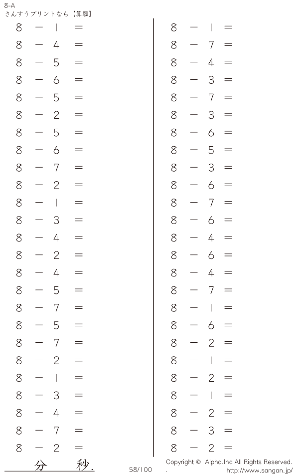 上記のボタンから「8-A…@50」の算数数学ドリル・計算ドリル(PDFプリント)がダウンロードできます。個人利用は無料です(家庭以外での配布は有料です)。