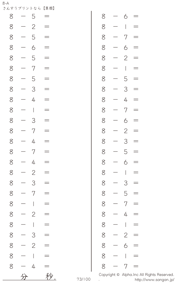 上記のボタンから「8-A…@50」の算数数学ドリル・計算ドリル(PDFプリント)がダウンロードできます。個人利用は無料です(家庭以外での配布は有料です)。