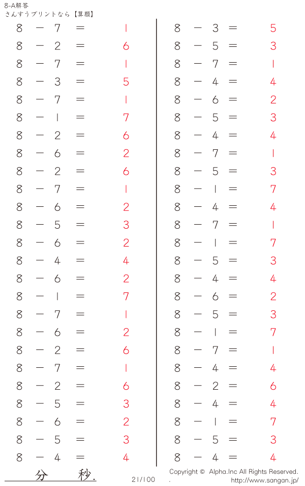上記のボタンから「8-A…@50」の算数数学ドリル・計算ドリル(PDFプリント)がダウンロードできます。個人利用は無料です(家庭以外での配布は有料です)。