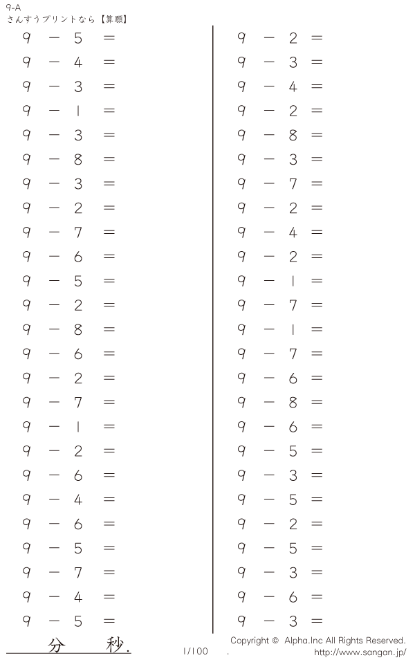 上記のボタンから「9-A…@50」の算数数学ドリル・計算ドリル(PDFプリント)がダウンロードできます。個人利用は無料です(家庭以外での配布は有料です)。