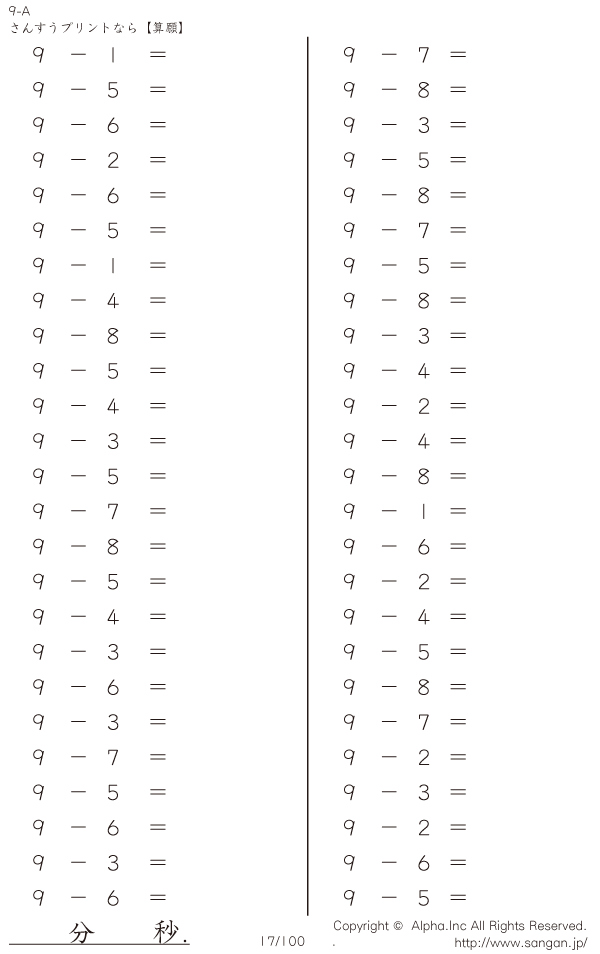 上記のボタンから「9-A…@50」の算数数学ドリル・計算ドリル(PDFプリント)がダウンロードできます。個人利用は無料です(家庭以外での配布は有料です)。