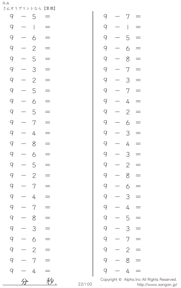 上記のボタンから「9-A…@50」の算数数学ドリル・計算ドリル(PDFプリント)がダウンロードできます。個人利用は無料です(家庭以外での配布は有料です)。