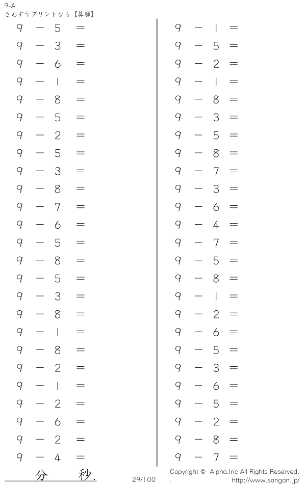 上記のボタンから「9-A…@50」の算数数学ドリル・計算ドリル(PDFプリント)がダウンロードできます。個人利用は無料です(家庭以外での配布は有料です)。