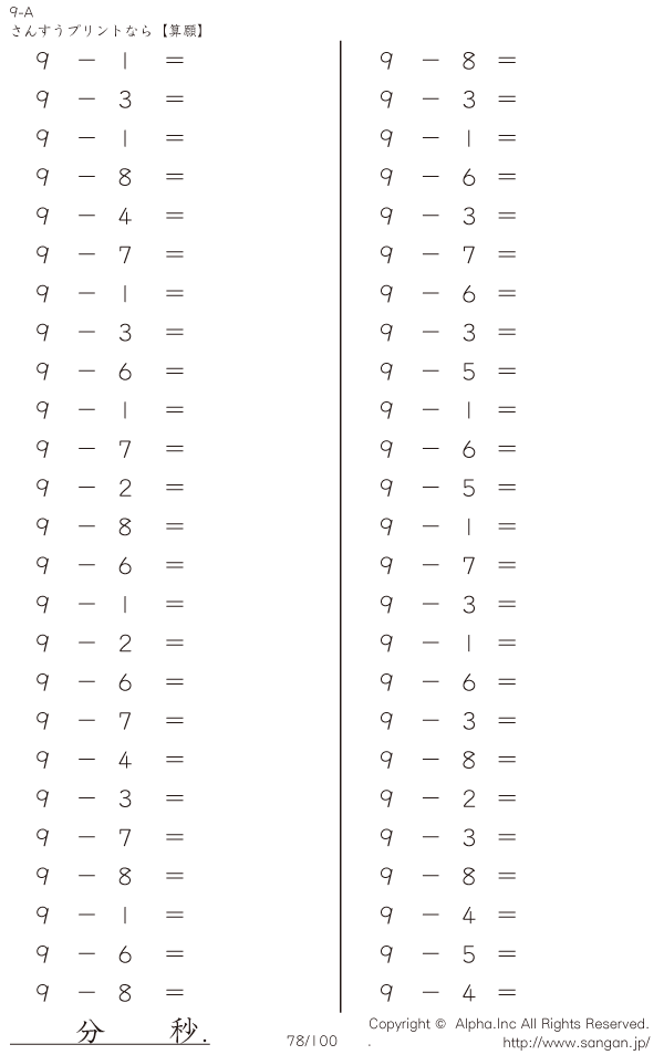 上記のボタンから「9-A…@50」の算数数学ドリル・計算ドリル(PDFプリント)がダウンロードできます。個人利用は無料です(家庭以外での配布は有料です)。
