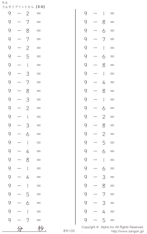 上記のボタンから「9-A…@50」の算数数学ドリル・計算ドリル(PDFプリント)がダウンロードできます。個人利用は無料です(家庭以外での配布は有料です)。