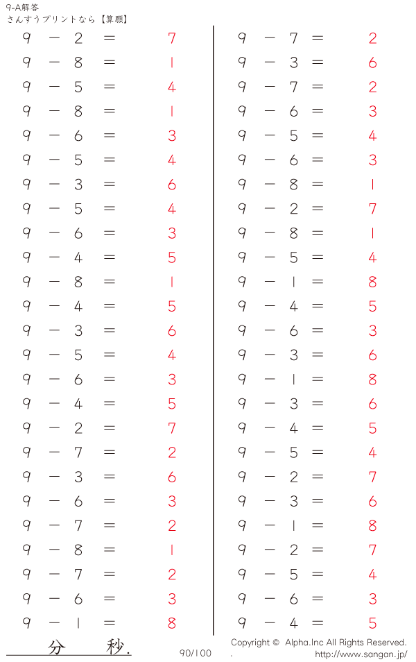 上記のボタンから「9-A…@50」の算数数学ドリル・計算ドリル(PDFプリント)がダウンロードできます。個人利用は無料です(家庭以外での配布は有料です)。