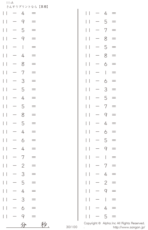 上記のボタンから「11-A…@50」の算数数学ドリル・計算ドリル(PDFプリント)がダウンロードできます。個人利用は無料です(家庭以外での配布は有料です)。