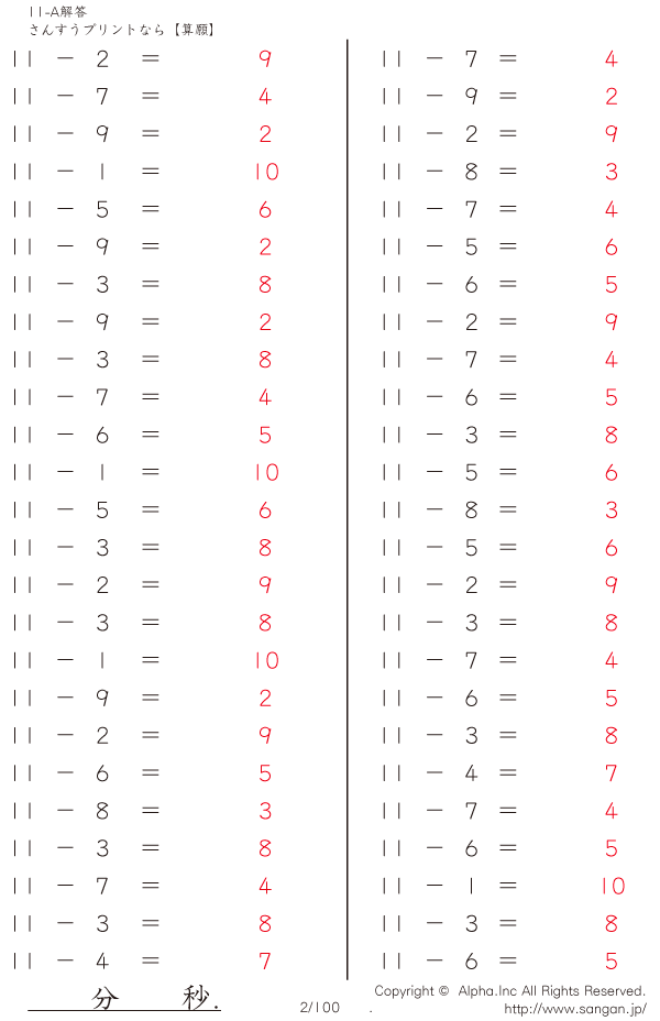 上記のボタンから「11-A…@50」の算数数学ドリル・計算ドリル(PDFプリント)がダウンロードできます。個人利用は無料です(家庭以外での配布は有料です)。