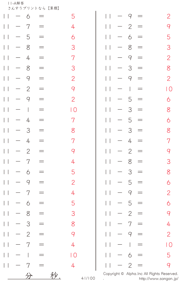 上記のボタンから「11-A…@50」の算数数学ドリル・計算ドリル(PDFプリント)がダウンロードできます。個人利用は無料です(家庭以外での配布は有料です)。