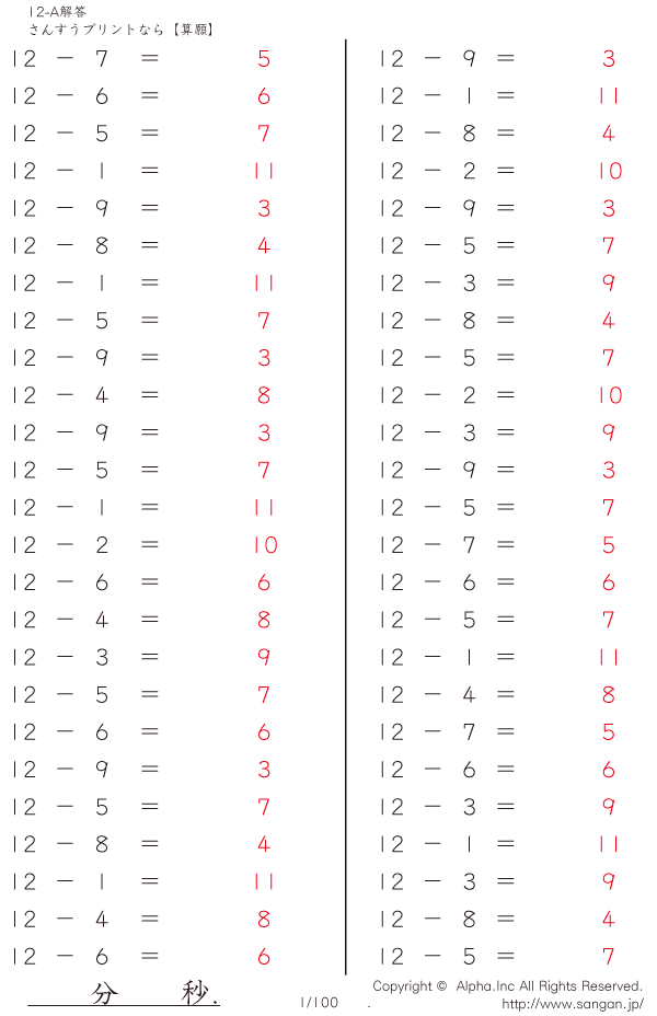 上記のボタンから「12-A…@50」の算数数学ドリル・計算ドリル(PDFプリント)がダウンロードできます。個人利用は無料です(家庭以外での配布は有料です)。