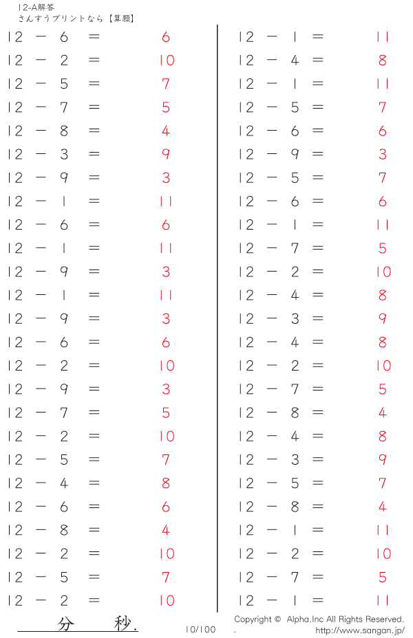 上記のボタンから「12-A…@50」の算数数学ドリル・計算ドリル(PDFプリント)がダウンロードできます。個人利用は無料です(家庭以外での配布は有料です)。