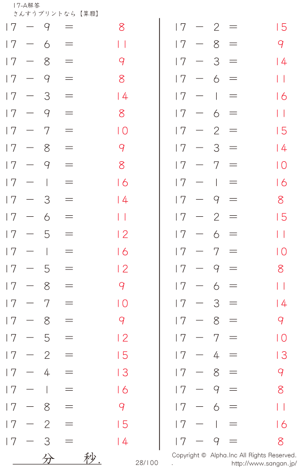 上記のボタンから「17-A…@50」の算数数学ドリル・計算ドリル(PDFプリント)がダウンロードできます。個人利用は無料です(家庭以外での配布は有料です)。