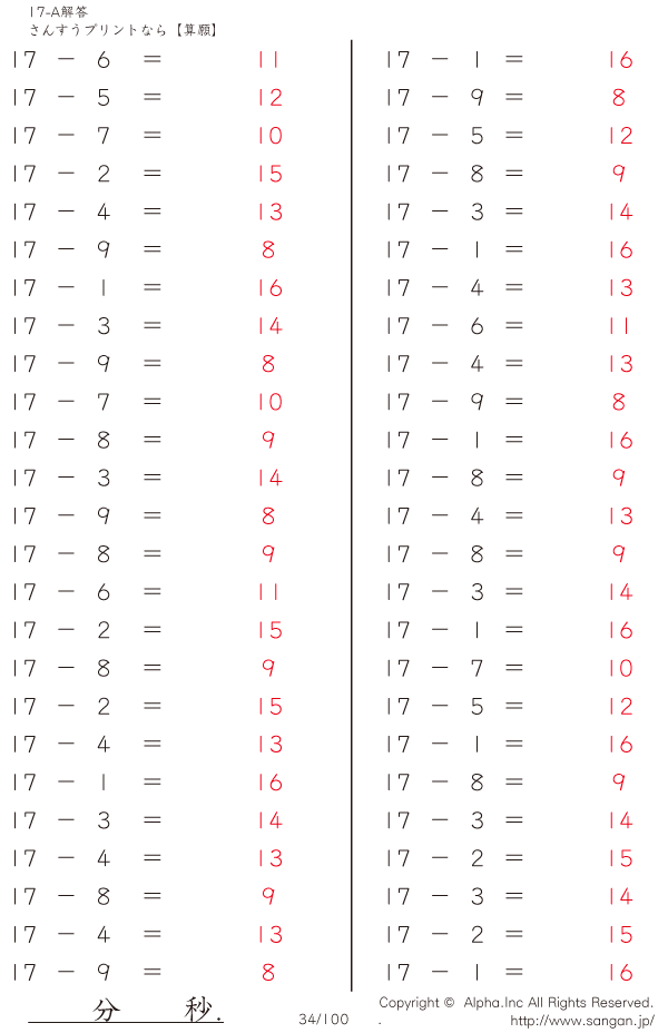 上記のボタンから「17-A…@50」の算数数学ドリル・計算ドリル(PDFプリント)がダウンロードできます。個人利用は無料です(家庭以外での配布は有料です)。