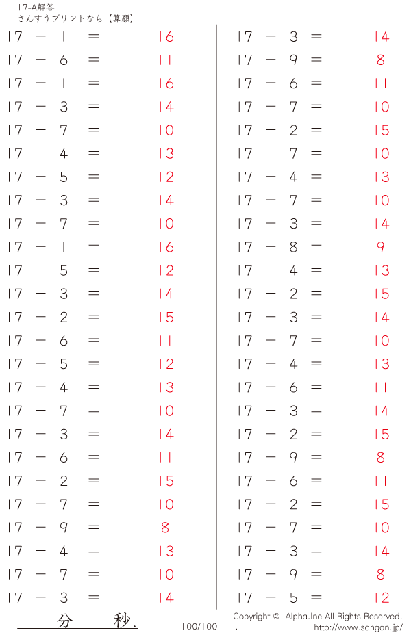 上記のボタンから「17-A…@50」の算数数学ドリル・計算ドリル(PDFプリント)がダウンロードできます。個人利用は無料です(家庭以外での配布は有料です)。