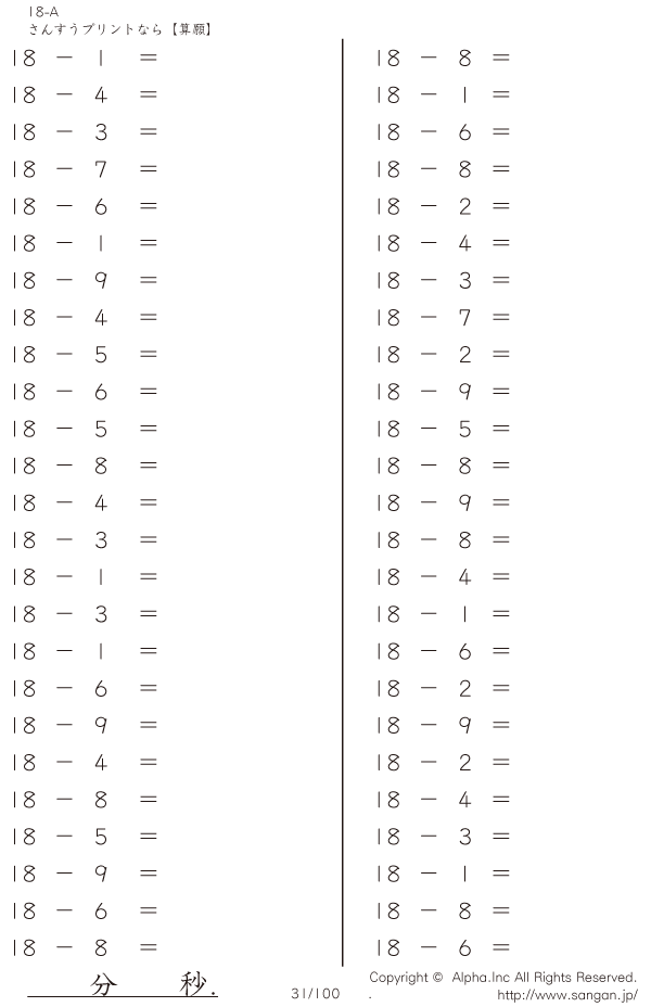 上記のボタンから「18-A…@50」の算数数学ドリル・計算ドリル(PDFプリント)がダウンロードできます。個人利用は無料です(家庭以外での配布は有料です)。