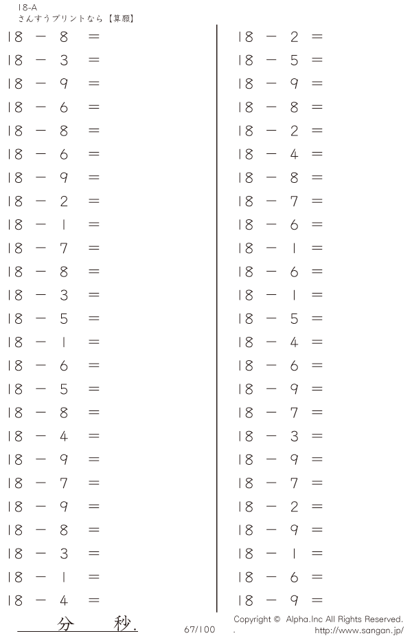 上記のボタンから「18-A…@50」の算数数学ドリル・計算ドリル(PDFプリント)がダウンロードできます。個人利用は無料です(家庭以外での配布は有料です)。