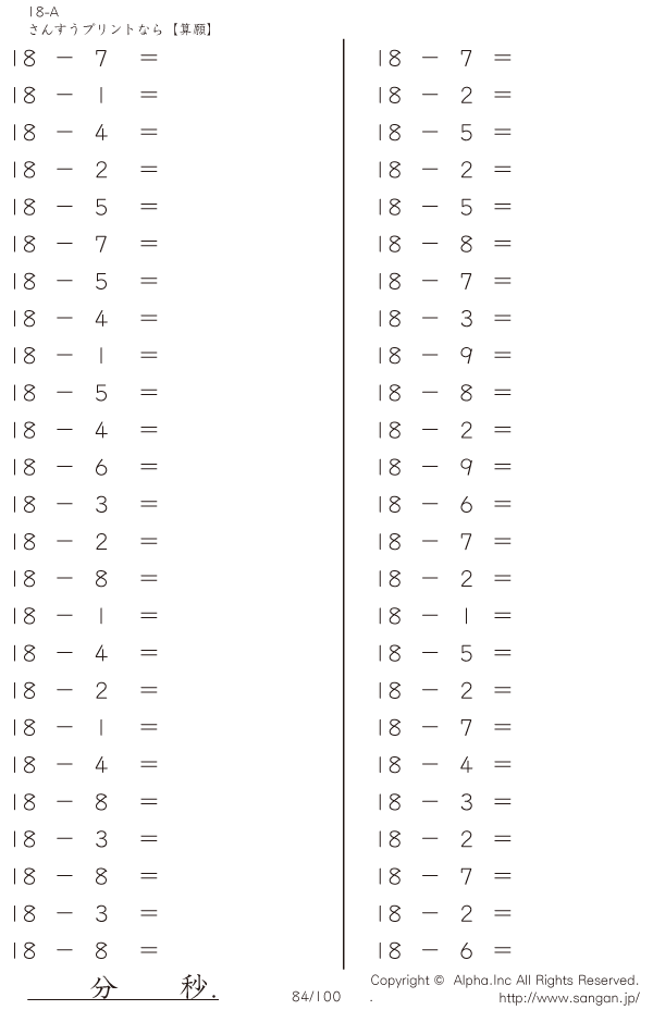 上記のボタンから「18-A…@50」の算数数学ドリル・計算ドリル(PDFプリント)がダウンロードできます。個人利用は無料です(家庭以外での配布は有料です)。