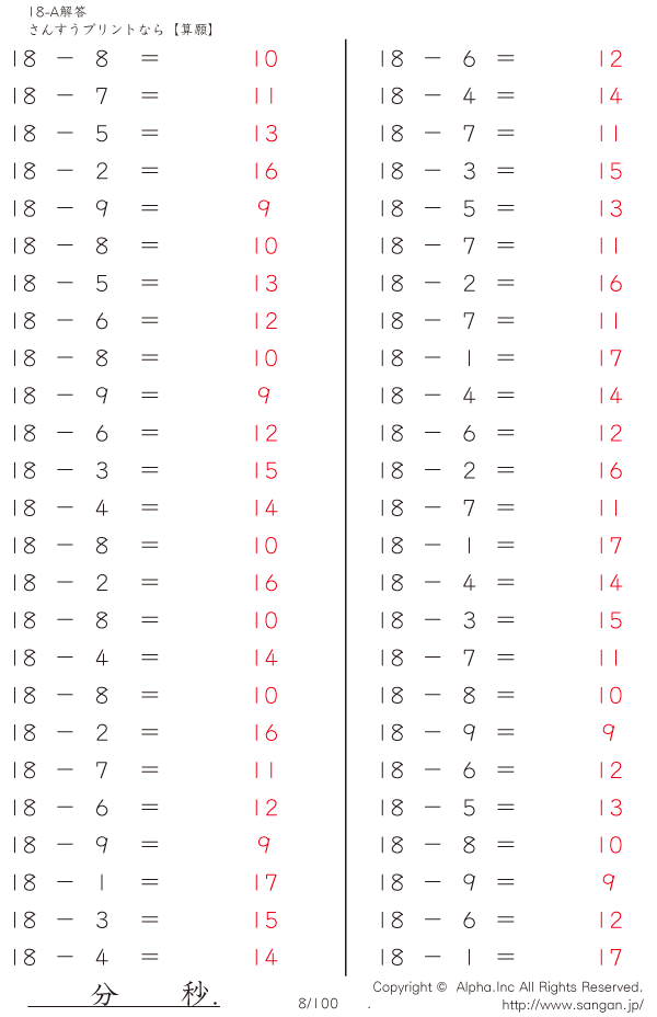 上記のボタンから「18-A…@50」の算数数学ドリル・計算ドリル(PDFプリント)がダウンロードできます。個人利用は無料です(家庭以外での配布は有料です)。