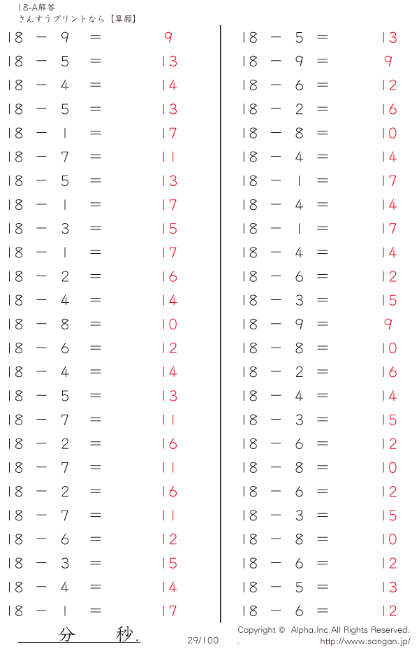 上記のボタンから「18-A…@50」の算数数学ドリル・計算ドリル(PDFプリント)がダウンロードできます。個人利用は無料です(家庭以外での配布は有料です)。