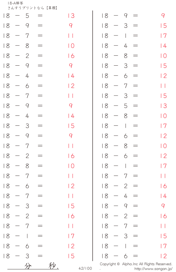 上記のボタンから「18-A…@50」の算数数学ドリル・計算ドリル(PDFプリント)がダウンロードできます。個人利用は無料です(家庭以外での配布は有料です)。