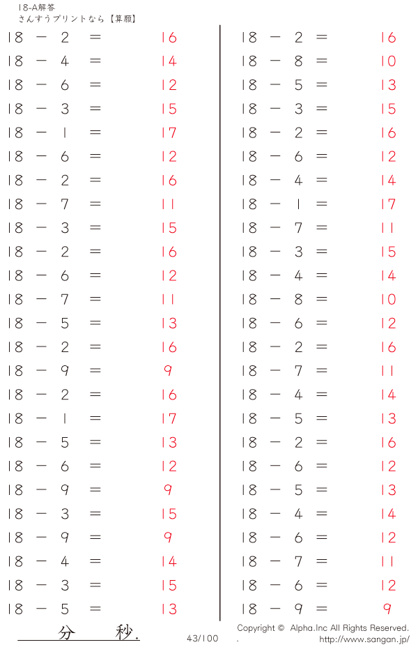 上記のボタンから「18-A…@50」の算数数学ドリル・計算ドリル(PDFプリント)がダウンロードできます。個人利用は無料です(家庭以外での配布は有料です)。