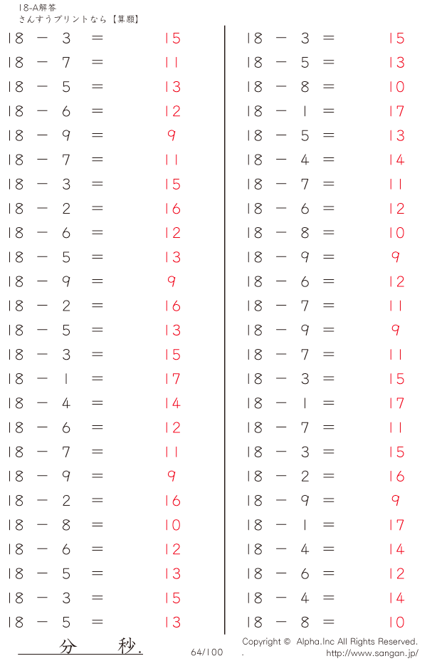 上記のボタンから「18-A…@50」の算数数学ドリル・計算ドリル(PDFプリント)がダウンロードできます。個人利用は無料です(家庭以外での配布は有料です)。