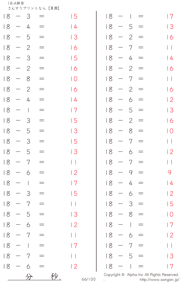 上記のボタンから「18-A…@50」の算数数学ドリル・計算ドリル(PDFプリント)がダウンロードできます。個人利用は無料です(家庭以外での配布は有料です)。