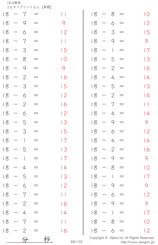 上記のボタンから「18-A…@50」の算数数学ドリル・計算ドリル(PDFプリント)がダウンロードできます。個人利用は無料です(家庭以外での配布は有料です)。