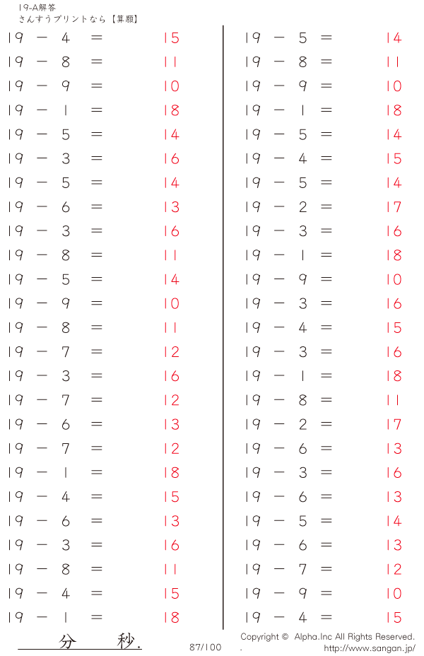 上記のボタンから「19-A…@50」の算数数学ドリル・計算ドリル(PDFプリント)がダウンロードできます。個人利用は無料です(家庭以外での配布は有料です)。