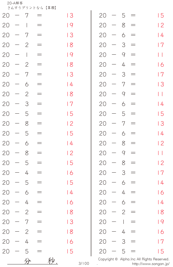 上記のボタンから「20-A…@50」の算数数学ドリル・計算ドリル(PDFプリント)がダウンロードできます。個人利用は無料です(家庭以外での配布は有料です)。