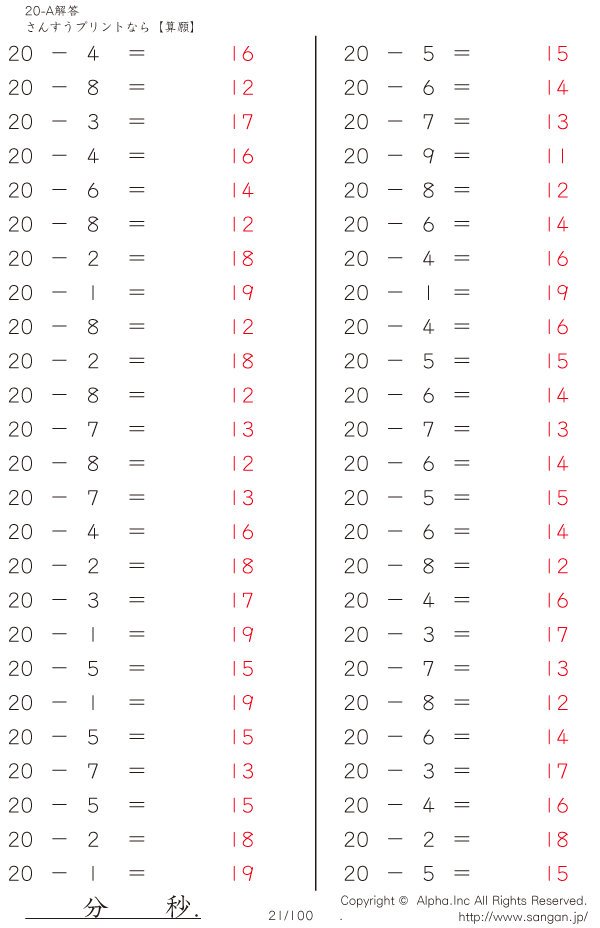 上記のボタンから「20-A…@50」の算数数学ドリル・計算ドリル(PDFプリント)がダウンロードできます。個人利用は無料です(家庭以外での配布は有料です)。