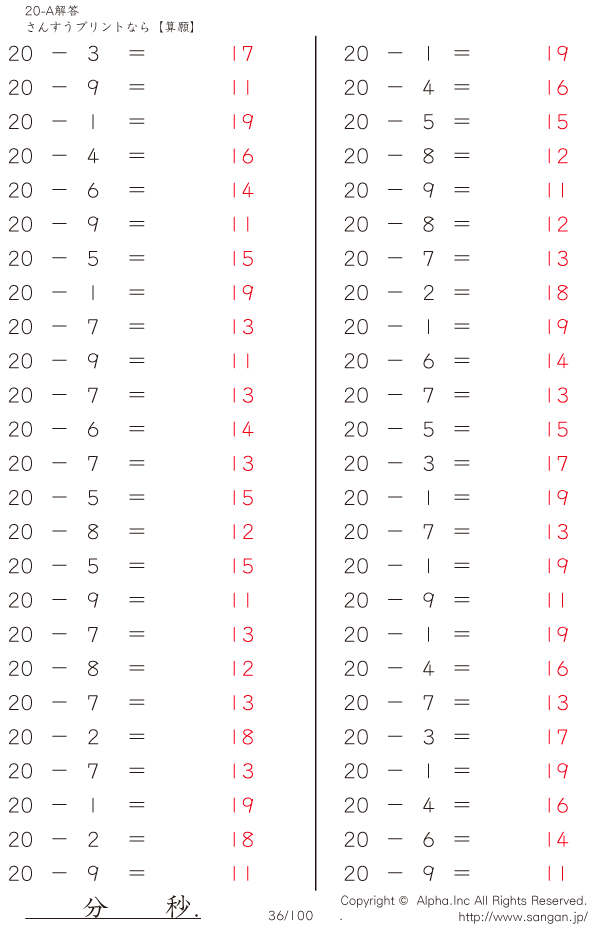 上記のボタンから「20-A…@50」の算数数学ドリル・計算ドリル(PDFプリント)がダウンロードできます。個人利用は無料です(家庭以外での配布は有料です)。