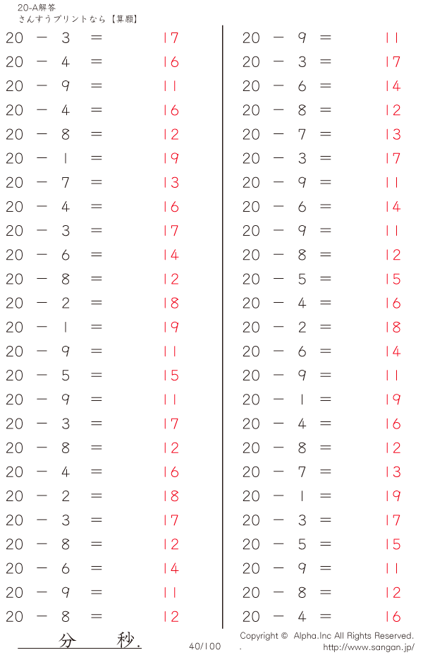 上記のボタンから「20-A…@50」の算数数学ドリル・計算ドリル(PDFプリント)がダウンロードできます。個人利用は無料です(家庭以外での配布は有料です)。