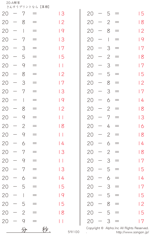 上記のボタンから「20-A…@50」の算数数学ドリル・計算ドリル(PDFプリント)がダウンロードできます。個人利用は無料です(家庭以外での配布は有料です)。