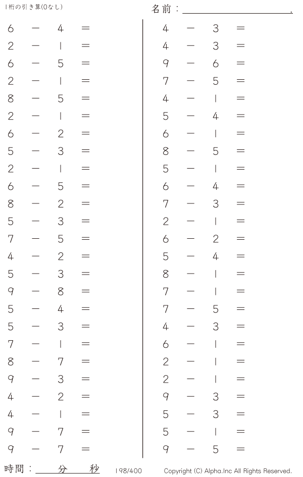上記のボタンから「1桁の引き算(0なし)」の算数数学ドリル・計算ドリル(PDFプリント)がダウンロードできます。個人利用は無料です(家庭以外での配布は有料です)。