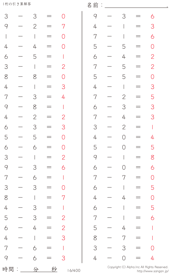 上記のボタンから「1桁の引き算(9まで)」の算数数学ドリル・計算ドリル(PDFプリント)がダウンロードできます。個人利用は無料です(家庭以外での配布は有料です)。