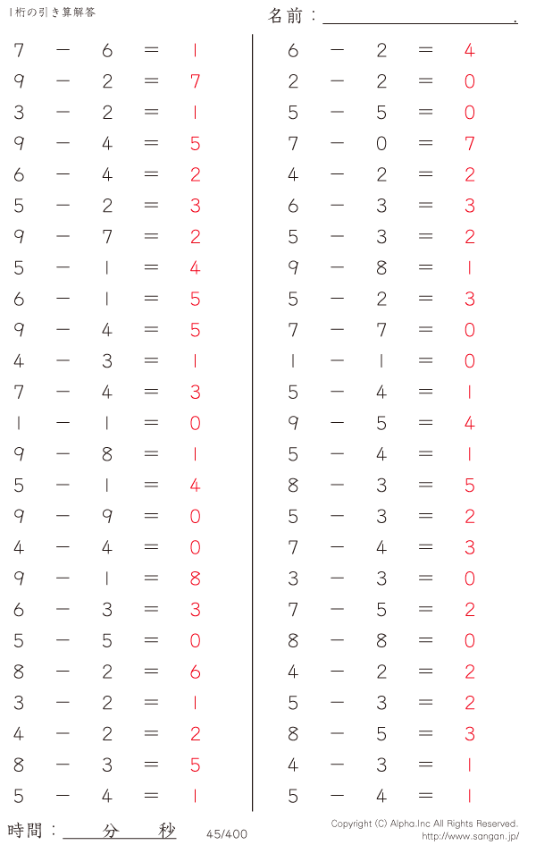 1桁の引き算(9まで) [解答]045/400