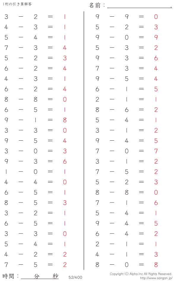 1桁の引き算(9まで) [解答]052/400
