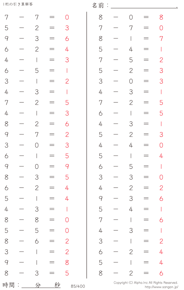 上記のボタンから「1桁の引き算(9まで)」の算数数学ドリル・計算ドリル(PDFプリント)がダウンロードできます。個人利用は無料です(家庭以外での配布は有料です)。