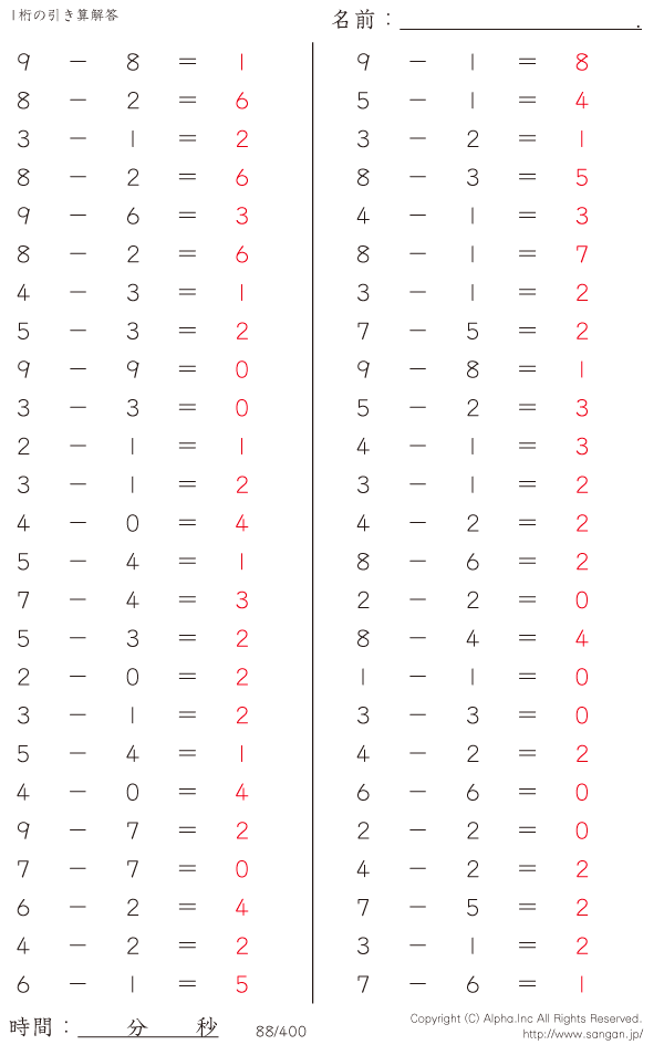 1桁の引き算(9まで) [解答]088/400