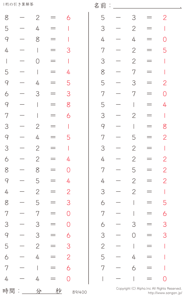 上記のボタンから「1桁の引き算(9まで)」の算数数学ドリル・計算ドリル(PDFプリント)がダウンロードできます。個人利用は無料です(家庭以外での配布は有料です)。