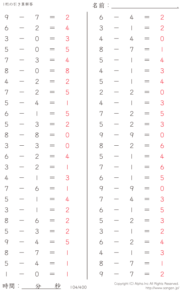 上記のボタンから「1桁の引き算(9まで)」の算数数学ドリル・計算ドリル(PDFプリント)がダウンロードできます。個人利用は無料です(家庭以外での配布は有料です)。